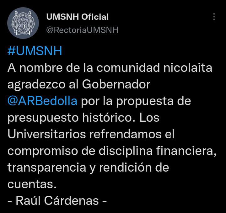 Tras de darse a conocer algunos montos incluidos en el paquete fiscal 2022 que ayer mando el gobernador Alfredo Ramírez Bedolla al Congreso del Estado para su discusión y aprobación, el rector de la Universidad Michoacana, Raúl Cárdenas Navarro agradeció este lunes en su cuenta de Twitter el aumento del 12 por ciento al presupuesto a asignar a la institución nicolaita, que son 396 millones de pesos más.