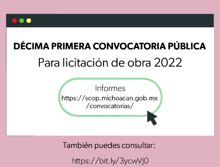 Para consultar la convocatoria completa, que contiene la información sobre las fechas límite y horarios de inscripción y adquisición de las bases, de las visitas a los lugares de los trabajos, juntas de aclaraciones, presentaciones y aperturas de proposiciones y de los fallos, la ciudadanía puede ingresar al siguiente enlace electrónico: https://scop.michoacan.gob.mx/wp-content/uploads/2022/06/Convocatoria-SCOP-2022-No.11-scaled.jpg