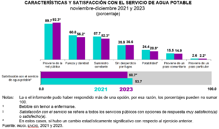 En 2023, 20.9 % de la población refirió que el servicio del agua potable en su ciudad es bebible sin temor a enfermarse.