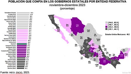 A nivel nacional, 48.2 % de la población confiaba en los gobiernos estatales -se refiere al porcentaje de población de 18 años y más en áreas urbanas a la que inspiraban mucha o algo de confianza-.