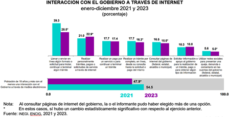 A nivel nacional, en 2023, 47.9 % de la población de 18 años y más tuvo al menos una interacción con el gobierno a través de internet; 28.5 % llenó y envió electrónicamente formatos para iniciar, continuar o terminar algún trámite; y 22.9 % realizó personalmente trámites, pagos o solicitudes de servicio a través de internet.