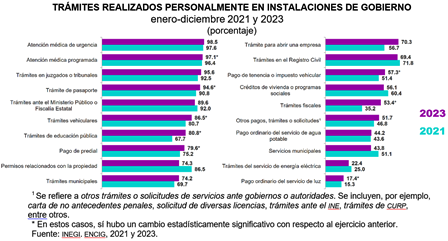 En 2023, el servicio para el que más se asistió a una instalación de gobierno fue atención médica de urgencia, con 98.5 por ciento. Por el contrario, el trámite para el que menos se tuvo que asistir a oficinas gubernamentales fue pago ordinario del servicio de luz, con 17.4 %.