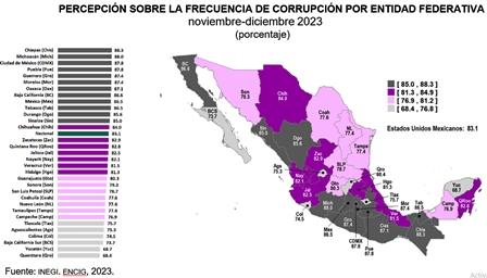 En 2023, 83.1 % de la población consideró frecuentes – se refiere a las opciones de respuesta frecuentes o muy frecuentes-, los actos de corrupción.