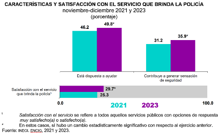 En cuanto al servicio de policía, en 2023 -periodo de noviembre y diciembre-, 49.8 % de la población de 18 años y más refirió que la policía de su ciudad tuvo disposición para ayudar.