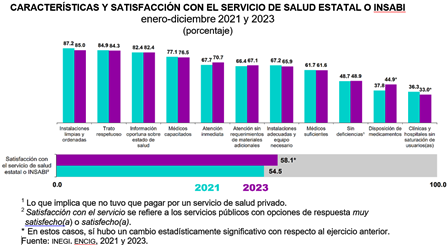 Durante 2023, 85.0 % de la población usuaria del servicio de salud estatal o del Instituto de Salud para el Bienestar (INSABI) refirió que la atención fue en instalaciones limpias y ordenadas.
