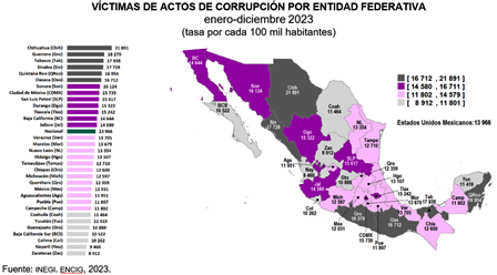 En 2023, la tasa de población que tuvo contacto con alguna persona servidora pública y experimentó al menos un acto de corrupción fue de 13 966 por cada 100 mil habitantes, a nivel nacional.