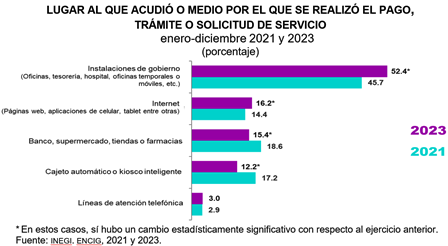 A nivel nacional, en 2023, 52.4 % de las personas usuarias acudieron a instalaciones de gobierno para realizar pagos, trámites o solicitudes de servicios públicos: 16.2 % utilizó internet —lo que refleja un incremento de 1.8 puntos porcentuales— y 15.4 % acudió a un banco, supermercado, tiendas o farmacias.