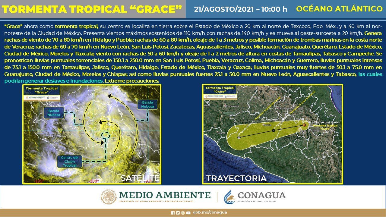 De acuerdo con el último reporte del Servicio Meteorológico Nacional (SMN), “Grace” se ubica, ya como Tormenta Tropical, a 20 kilómetros de Texcoco, en el Estado de México.