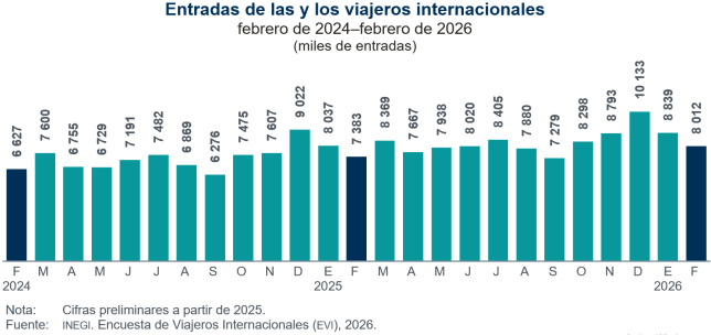 En febrero de 2026 ingresaron al país 8 millones 012 mil 213 viajeras y viajeros internacionales, 8.5 % más que en el mismo mes de 2025. De esta cantidad, 3 millones 880 mil 812 (48.4 %) entraron como turistas internacionales —residentes en el extranjero que pernoctaron en México— (ingresaron 4.2 % más que en febrero de 2025) y 4 millones 131 mil 401 (51.6 %) lo hicieron como excursionistas internacionales —que no pernoctaron en su viaje—.