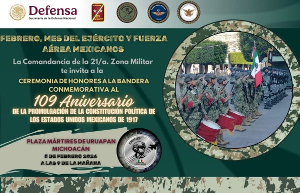 En el marco de los eventos de febrero, mes del Ejército y Fuerza Aérea Mexicanos, la 21/a. Zona Militar, te invita a la Ceremonia de Honores a la Bandera “Conmemorativa al 109 Aniversario de la Promulgación de la Constitución Política de los Estados Unidos Mexicanos de 1917” en Uruapan.