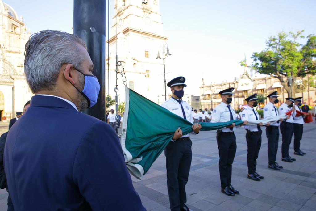 Morelia, Michoacán.- Con motivo del CXI aniversario del inicio de la Revolución Mexicana, el gobernador Alfredo Ramírez Bedolla, encabezó el acto de izamiento de la Bandera Nacional, en la Plaza Melchor Ocampo.