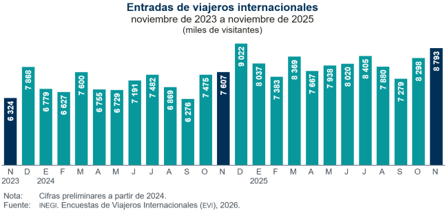 En noviembre de 2025 ingresaron al país 8 millones 792 mil 968 visitantes, 15.6 % más que en el mismo mes de 2024. De esta cantidad, 4 millones 164 mil 530 (47.4 %) fueron turistas internacionales —viajeras y viajeros residentes en el extranjero que pernoctaron en México—, ingresaron 5.6 % más que en noviembre del año pasado, y 4 millones 628 mil 438 (52.6 %) fueron excursionistas —visitantes que no pernoctaron en su viaje—.
