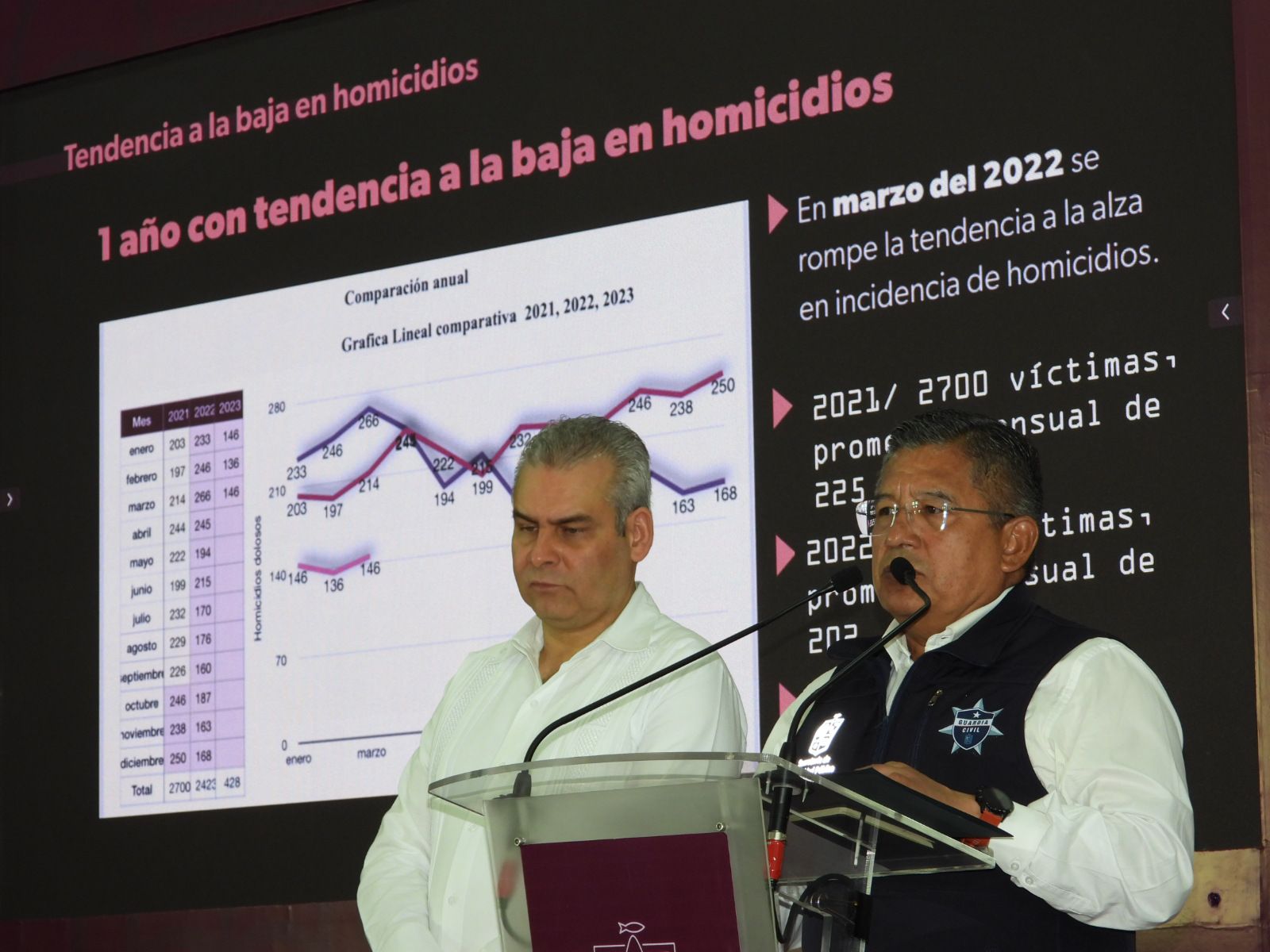 Acompañado por el secretario de Seguridad Pública, José Ortega Reyes se informó que han disminuido los homicidios dolosos de 246 a 142 de marzo de 2022 a 2023.