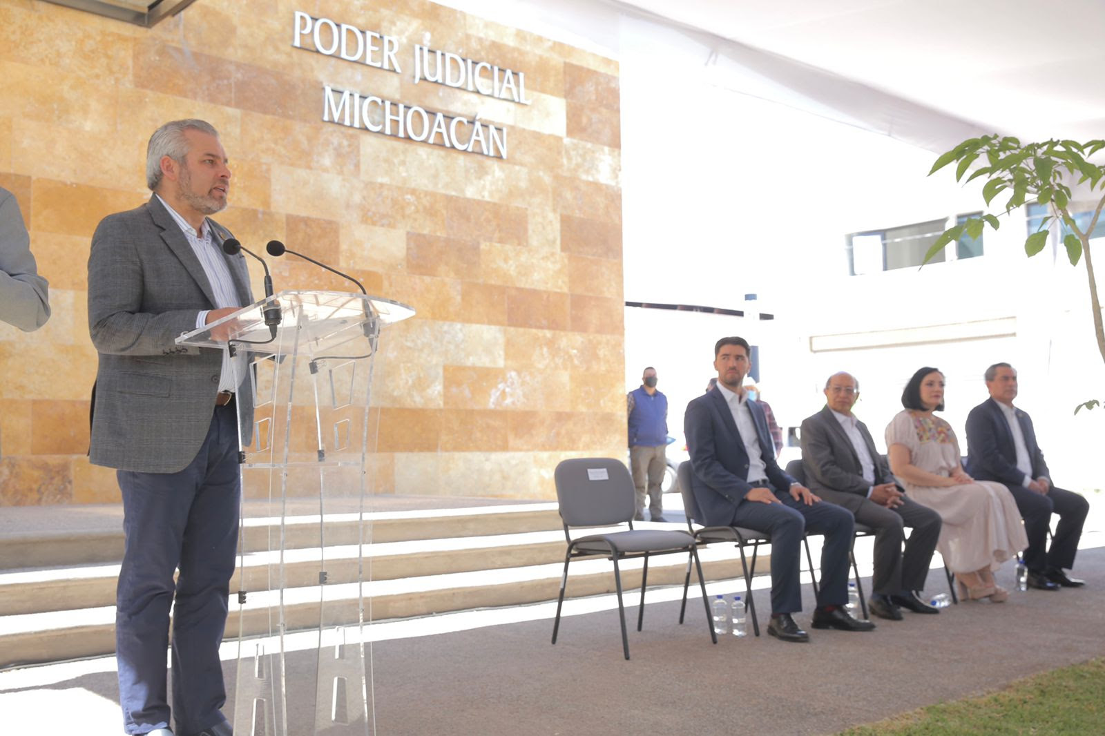 Sahuayo, Michoacán.- El gobernador Alfredo Ramírez Bedolla y el presidente del Supremo Tribunal de Justicia y del Consejo del Poder Judicial de Michoacán, Jorge Reséndiz García, pusieron en marcha las instalaciones de Ciudad Judicial en Sahuayo, y con ello, inician las funciones de la Unidad de Gestión del Sistema de Justicia Penal Acusatorio y Oral en la región.