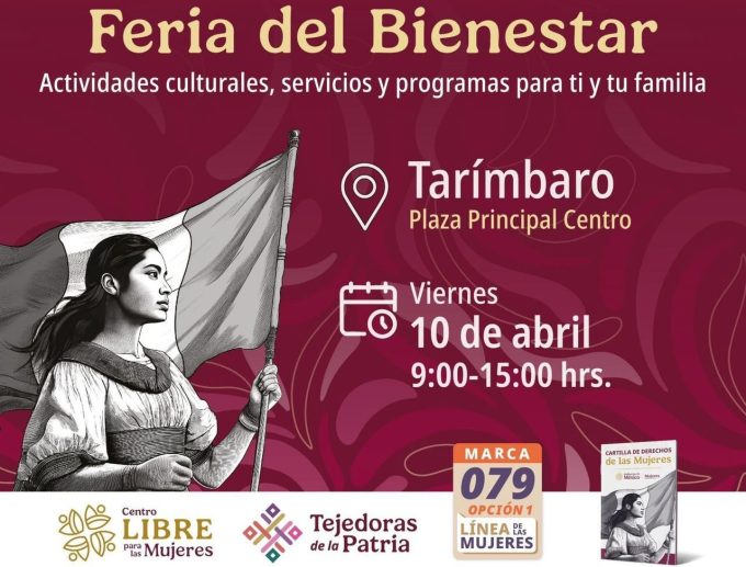 La Feria del Bienestar se llevará a cabo en la Plaza Principal de Tarímbaro, en un horario de 9:00 a 15:00 horas, donde la ciudadanía podrá informarse y aprovechar los apoyos que el Gobierno Federal acerca a los tarimbarenses.