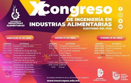 La Secretaría de Turismo de Michoacán (Sectur) y autoridades del Instituto Tecnológico Superior de Uruapan, invitan a la décima edición del Congreso de Ingeniería en Industrias Alimentarias, a realizarse del 26 al 28 de abril en las instalaciones del propio plantel.