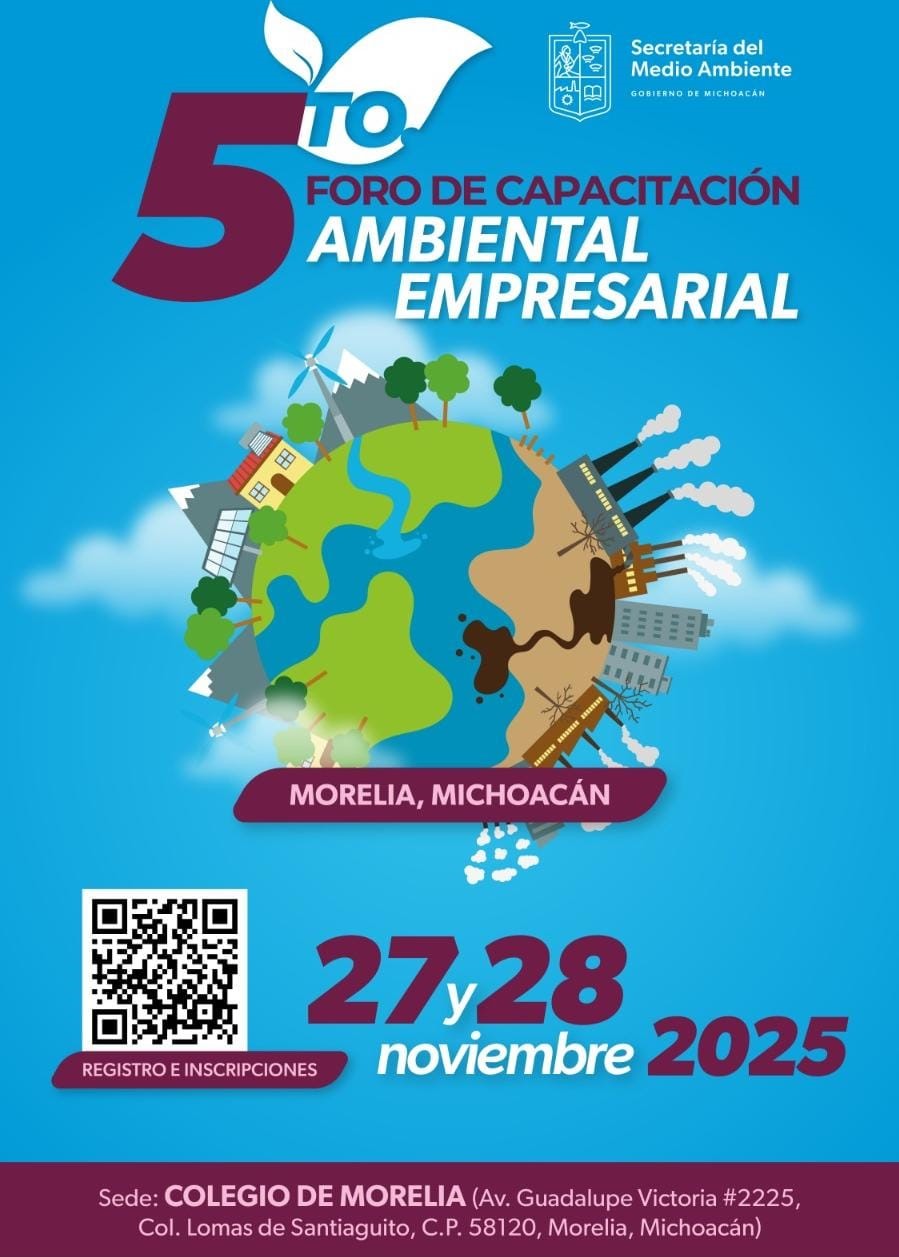 En el marco del Día Nacional de la Conservación, la Secretaría del Medio Ambiente de Michoacán (Secma) convoca al Quinto Foro de Capacitación Ambiental Empresarial, que se desarrollará el 27 y 28 de noviembre en el Colegio de Morelia, en la capital michoacana.