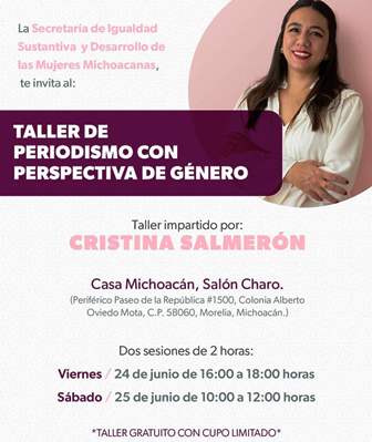 Con el objetivo de sensibilizar a los profesionales de los medios de comunicación y potenciar un ejercicio periodístico responsable en el Estado, la Secretaría de Igualdad Sustantiva y Desarrollo de las Mujeres Michoacanas (Seimujer), invita al “Taller de periodismo con perspectiva de género”.