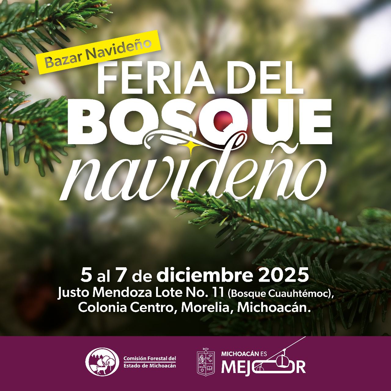 La Comisión Forestal de Michoacán (Cofom) invita a la ciudadanía a disfrutar la magia de la Feria del Bosque Navideño 2025, que se llevará a cabo del 5 al 7 de diciembre en las instalaciones de la dependencia, ubicadas en Bosque Cuauhtémoc, Lote 11, Morelia Centro.