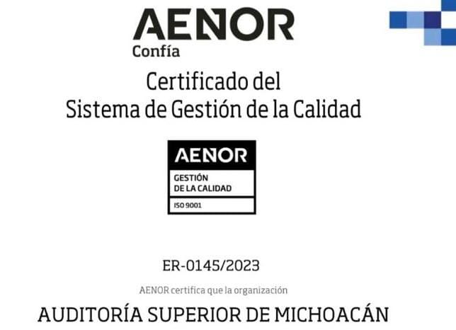 La Auditoría Superior de Michoacán (ASM), logró la certificación en Sistema de Gestión de Calidad ISO 9001:2015 con la casa certificadora AENOR; convirtiéndose en el primer ente de fiscalización en el país en obtenerla para la totalidad de sus procesos; tales como, Planeación, Fiscalización, Investigación y Substanciación de Responsabilidades Administrativas que desarrolla la dependencia.