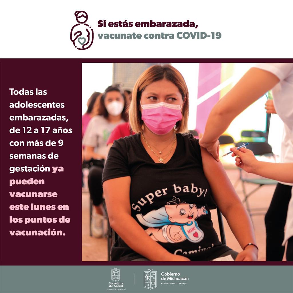 Morelia, Michoacán.- Todas las embarazadas de 12 a 17 años y con más de nueve semanas de gestación aún pueden vacunarse contra el COVID-19, ya que el lunes 25 y martes 26 de octubre, los módulos seguirán abiertos, en los hospitales de la Secretaría de Salud de Michoacán (SSM), Instituto Mexicano del Seguro Social (IMSS) e Instituto de Seguridad Social al Servicio de los Trabajadores del Estado (ISSSTE).