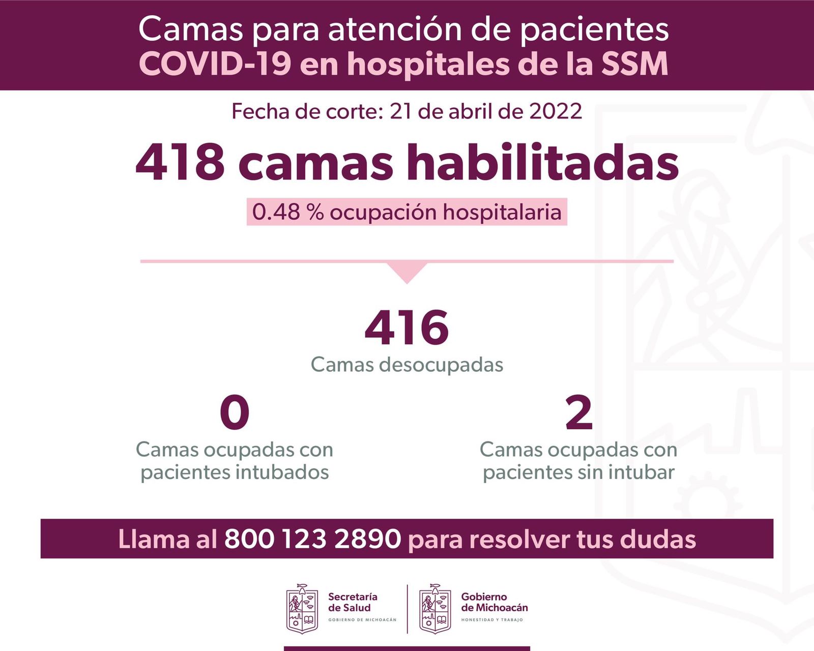 La Secretaría de Salud de Michoacán (SSM) informa que la ocupación hospitalaria para la atención de pacientes con COVID-19 es del 1.03%, cifra inferior a la media nacional que es del 27.1%.