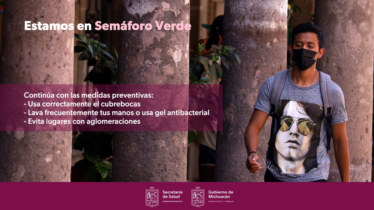 La Secretaría de Salud (SSM), informa que, del 18 de abril al 1 de mayo, Michoacán permanecerá en verde del semáforo de riesgo epidemiológico por Covid-19, por lo que se exhorta a la población a seguir con acciones de prevención, utilizando el cubrebocas en espacios cerrados y en el transporte público.