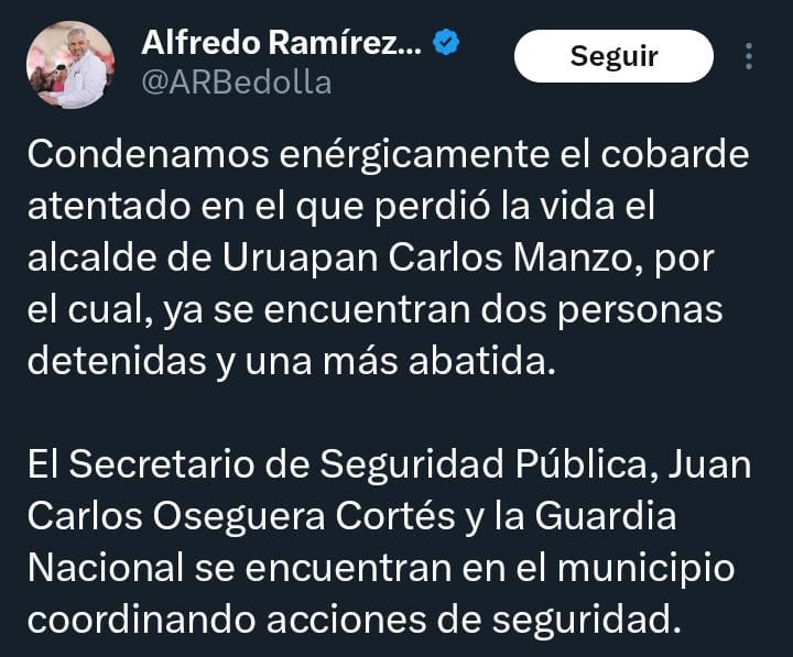 Además el gobernador Alfredo Ramírez Bedolla también informó que fueron detenidas dos personas involucradas en los hechos uno de los agresores murió en el lugar