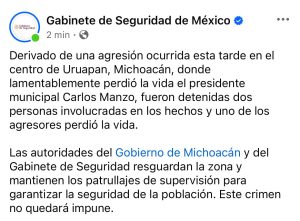 El gabinete de seguridad federal, confirmó que derivado de la agresión ocurrida en el centro de la ciudad el alcalde perdió la vida.