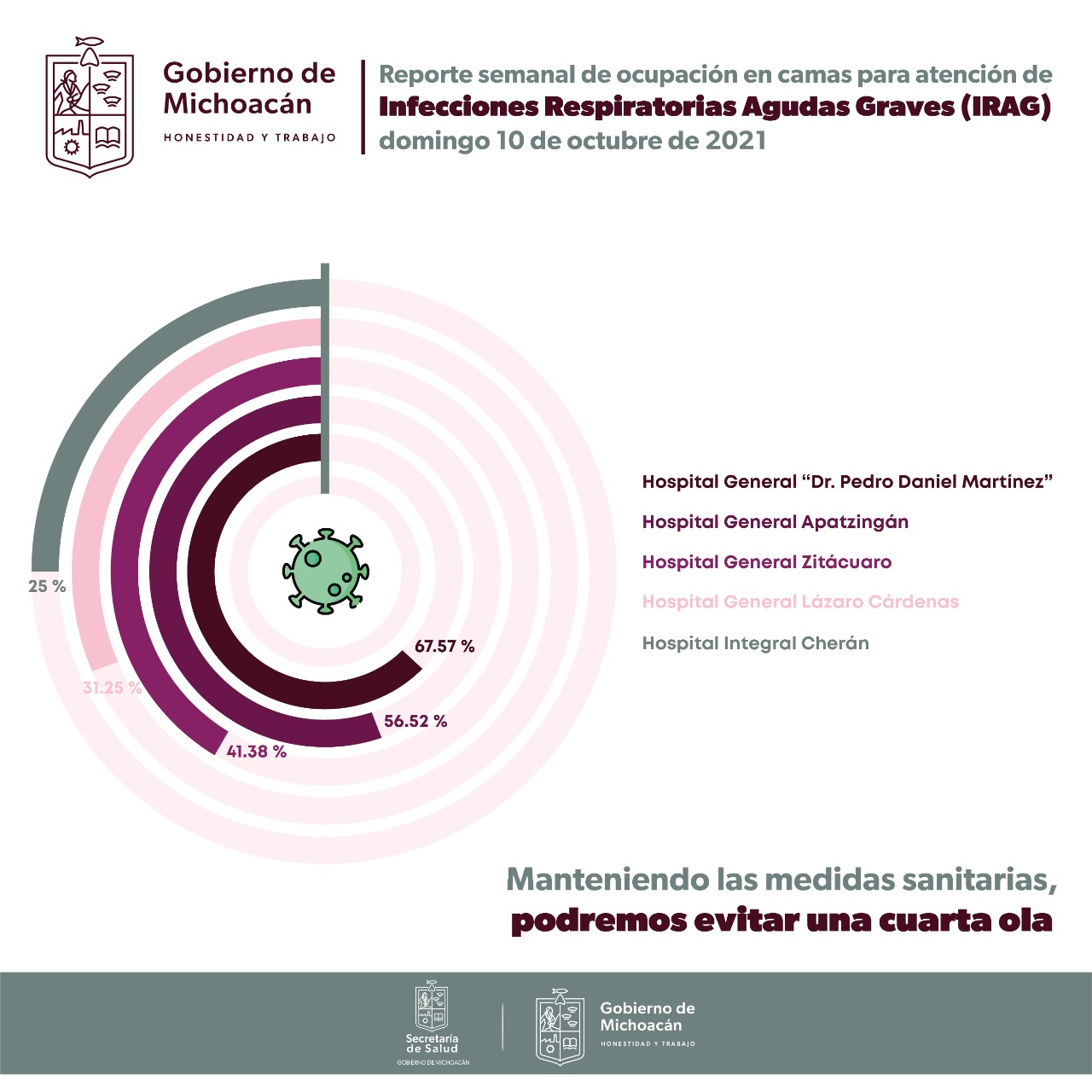Morelia, Michoacán.- La Secretaría de Salud de Michoacán (SSM), informa que la ocupación de camas para la atención de Infecciones Respiratorias Agudas Graves (IRAG), en el Hospital General de Uruapan “Dr. Pedro Daniel Martínez”, registra el 67.57 por ciento de su capacidad.