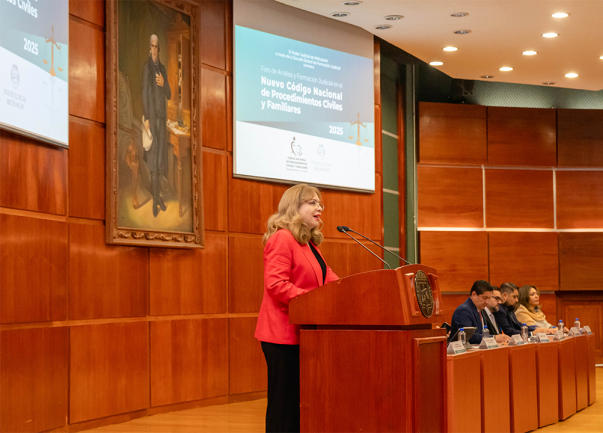 “Para la implementación efectiva del Código Nacional de Procedimientos Civiles y Familiares (CNPCyF) se prevé establecer procesos de profesionalización y actualización permanente y periódica para todo el personal, que garanticen un alto nivel de calidad en su desempeño, con base en ello, la Comisión Multidisciplinaria para su implementación en el Poder Judicial de Michoacán, ha identificado como prioritaria la capacitación en los cambios introducidos en este ordenamiento”, destacó la magistrada Monserrat Pérez Marín quien funge como coordinadora de la Comisión, durante la inauguración del Foro de análisis y formación judicial en el Nuevo CNPCyF.
