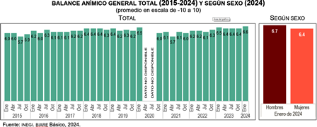 Entre 2015 y 2024, el promedio del balance anímico general durante enero de 2024, se situó en 6.6. Este nivel es el más alto de la serie y la cifra muestra un incremento de una décima respecto al balance reportado en enero de 2023. Para enero de 2024, el balance anímico general según sexo, permite observar la brecha de tres décimas entre el balance que promedian los hombres respecto al de las mujeres: 6.7 en el caso de ellos y 6.4 en el caso de ellas.