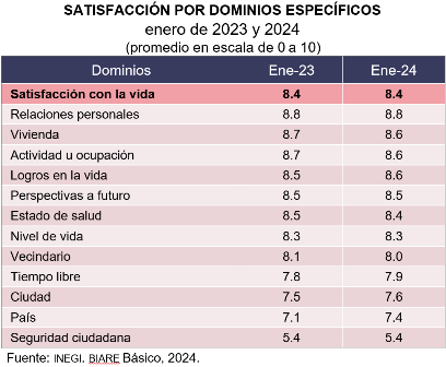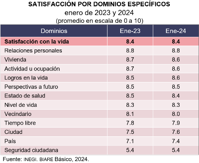 En enero de 2024, al evaluar dominios específicos de la vida, la población adulta se dijo más satisfecha en sus ámbitos personales que en los públicos. La población adulta reportó estar más satisfecha con sus relaciones personales, ámbito que presentó el promedio más alto de satisfacción, con un resultado de 8.8. Siguieron los ámbitos de vivienda, actividad u ocupación y logros en la vida, con 8.6 en cada dominio. Por su parte, el promedio de satisfacción con las perspectivas a futuro fue 8.5. La satisfacción con estado de salud resultó en 8.4.