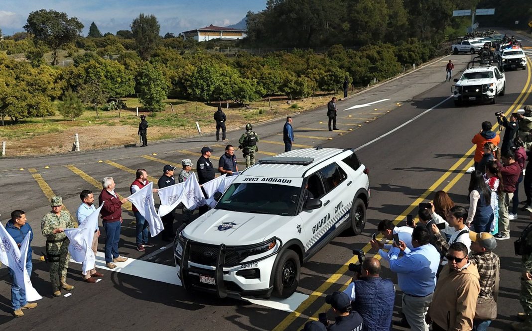 Zacán, Michoacán.- Para reforzar la seguridad en el tramo carretero Uruapan-Peribán, el gobernador Alfredo Ramírez Bedolla en la comunidad con autogobierno de Zacán, puso en marcha el operativo Guardianes del Camino, integrado por Guardia Civil, Ejército Mexicano y Guardia Nacional.