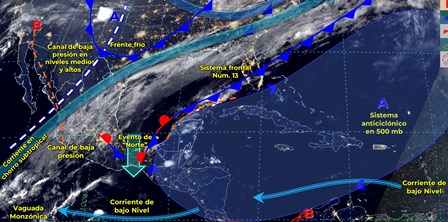 Para este lunes, el sistema frontal Núm. 13 se extenderá con características de estacionario sobre el sureste mexicano y la Sonda de Campeche, continuará interactuando con el abundante ingreso de humedad generado por la corriente en chorro subtropical y con un canal de baja presión en niveles medios y altos de la atmosfera, previéndose lluvias puntuales torrenciales en Veracruz (sur), Chiapas y Tabasco; lluvias puntuales intensas en Oaxaca, Campeche y Yucatán; muy fuertes en Puebla; así como chubascos y lluvias fuertes sobre entidades del norte, noreste, centro y oriente del territorio nacional, incluyendo al estado de Quintana Roo.