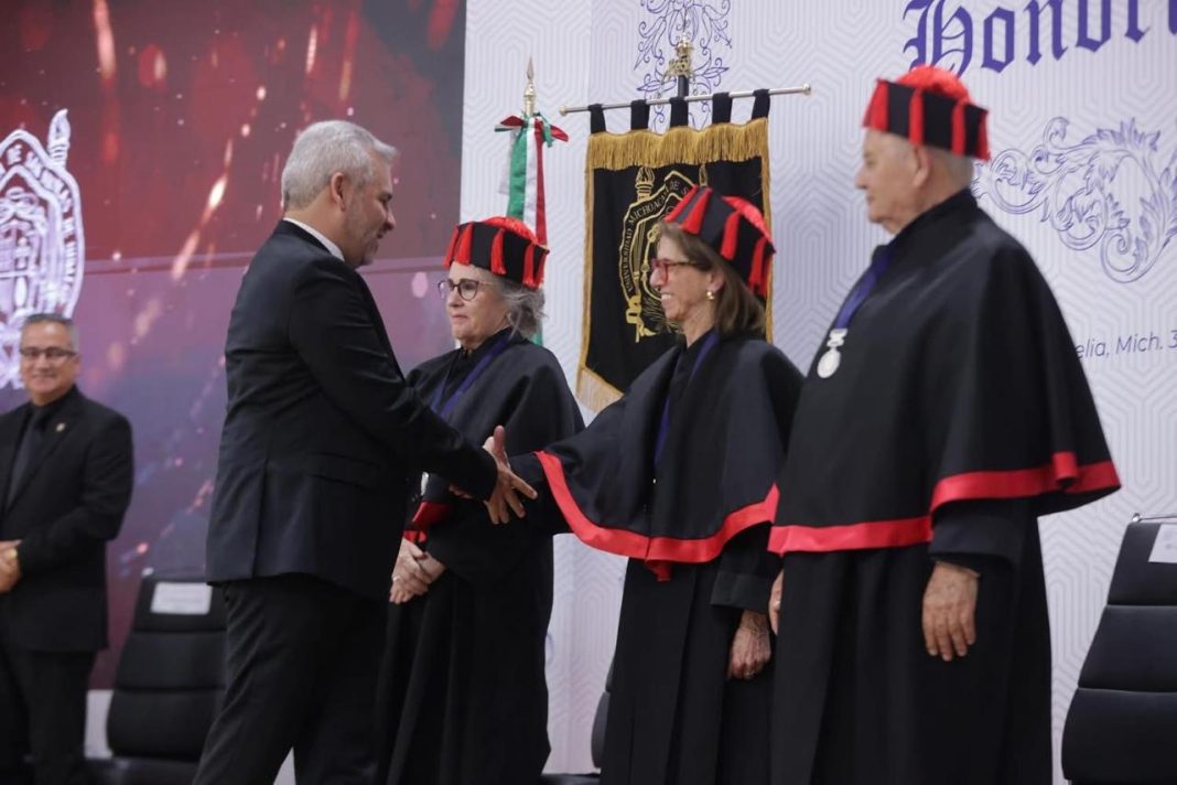 En sesión solemne del Consejo Universitario de la Máxima Casa de Estudios de la entidad, el mandatario reconoció la aportación a la sociedad en diversos campos del conocimiento, la excelencia y la vocación humanista de las y el galardonado; y refrendó también su apoyo a la Universidad Michoacana.