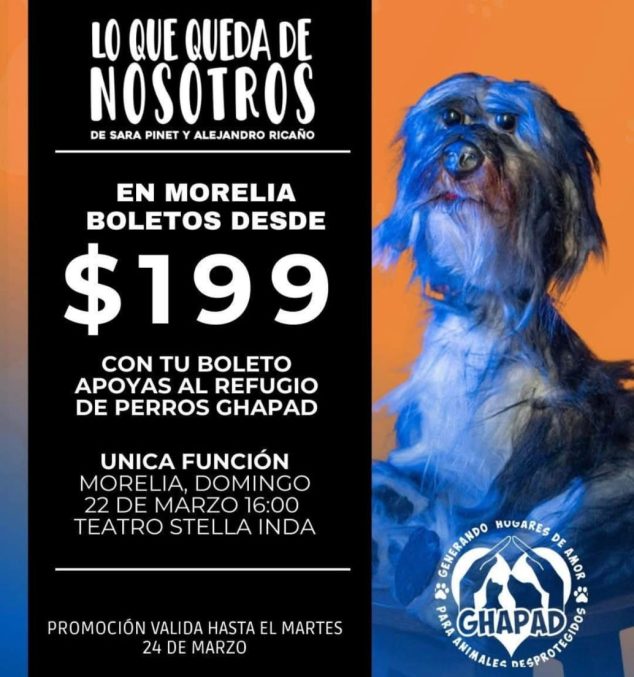 Porque ayudar también puede ser un plan de domingo y no necesariamente caro, la asociación Generando Hogares de Amor para Animales Desprotegidos (GHAPAD) continúa promoviendo la asistencia a la obra «Lo que queda de nosotros», programada para este 22 de marzo a las 16:00 horas en el teatro Stella Inda de esta ciudad.