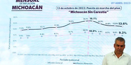 Méndez Fernández refirió que al iniciar el monitoreo, el 22 de octubre de 2022, la inflación alimentaria en Michoacán estaba en 16.1 por ciento, en tanto que al 7 de abril fue de 13.6; mientras que la inflación general bajó 0.8 por ciento en el mismo periodo, al pasar de 10 por ciento a 9.2 por ciento; consideró como factores positivos para la reducción de la inflación el aumento en exportaciones, así como en Inversión Extranjera Directa (IED) que se da por el nearshoring o reubicación de empresas internacionales.