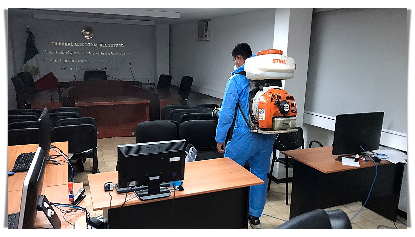 Morelia, Michoacán.- En aras seguir salvaguardando la salud y la vida de las y los trabajadores así como de las y los ciudadanos que visitan el Tribunal Electoral del Estado de Michoacán, este viernes se llevó a cabo una vez más la tarea de sanitización de las oficinas que albergan a la institución.