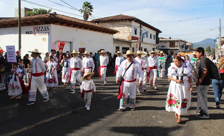 Con la participación de varios de los contingentes que participan como parte de la presentación de la K’uínchekua, donde se pudieron apreciar los jugadores de pelota, así como los toritos de Petate entre otros portadores de las tradiciones michoacanas, que al ritmo de la música iban danzando por la calle principal e invitando a las personas que salieron a verlos a seguir la fiesta.