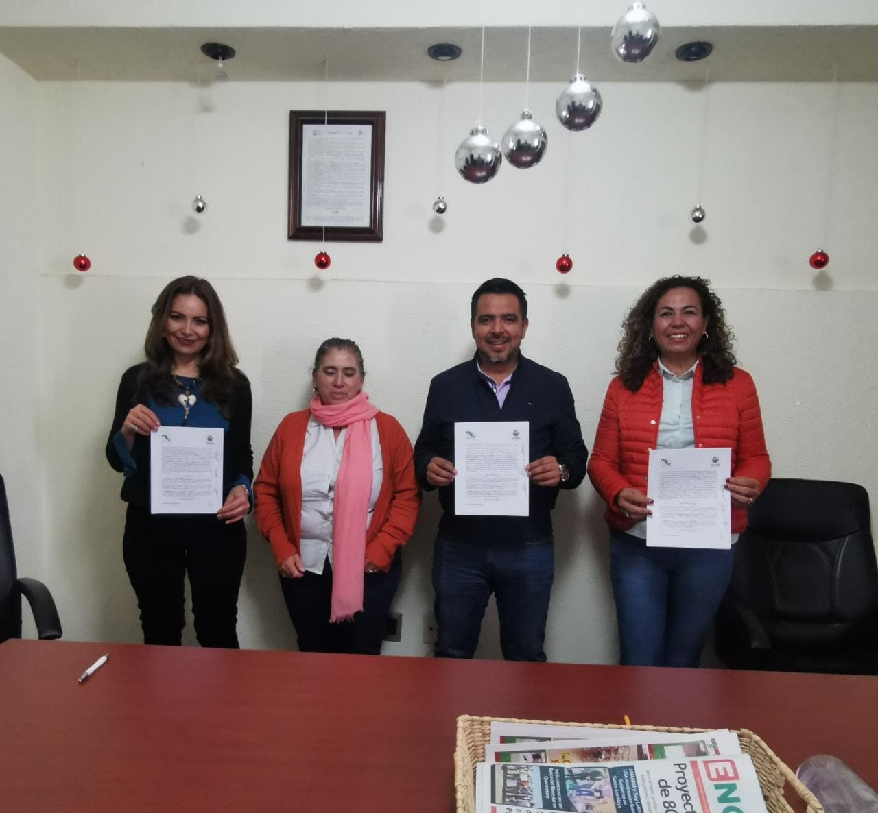 En esta firma de convenio estuvieron presentes, Alondra Villaseñor Fernández, Presidenta de los productores y servicios gastronómicos de Charo A.C. ; Sara Edith Facio García, Síndica municipal; Salvador Cortés Espíndola, Presidente municipal de Charo y Tiatira Solís Pineda, directora del plantel 34 Irapeo.