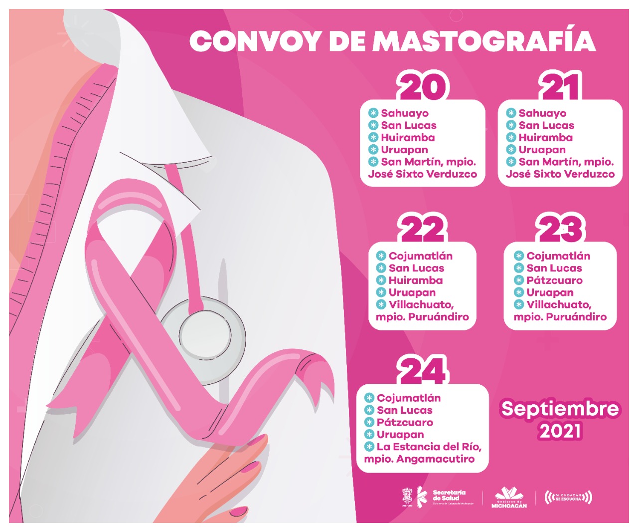 La SSM exhorta a las mujeres de estas localidades a que acudan a realizarse su mastografía, ya que es considerada el método más eficaz para un diagnóstico oportuno de cáncer de mama, con impacto en la reducción de la mortalidad.