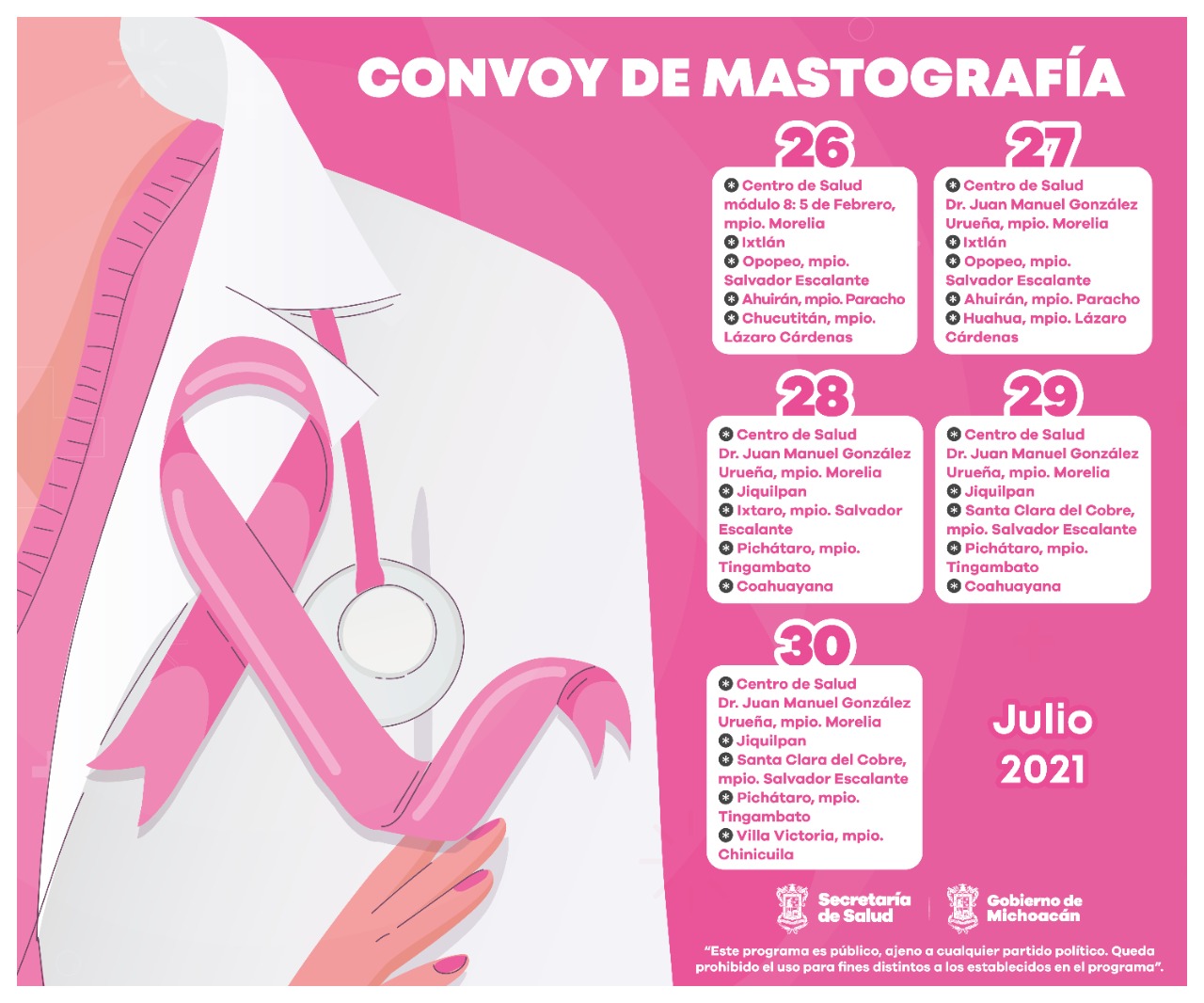 La SSM hace el exhorto a las mujeres michoacanas para que acudan a las unidades a efectuarse su mastografía, sobre todo aquellas mujeres que tienen entre los 40 y 69 años de edad, o quienes tienen antecedentes familiares, tomando en cuenta las indicaciones sanitarias como uso de cubrebocas, uso de gel antibacterial, mantener sana distancia y no tener sintomatología COVID-19.