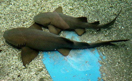 La pareja de macho y hembra es de la especie Ginglymostoma Cirratum. A pesar de su tamaño, aspecto intimidador y gran cantidad de dientes, este tipo de tiburón suele ser inofensivo y sólo reacciona violentamente al ser provocado, lo que en nuestro acuario facilita su cuidado.