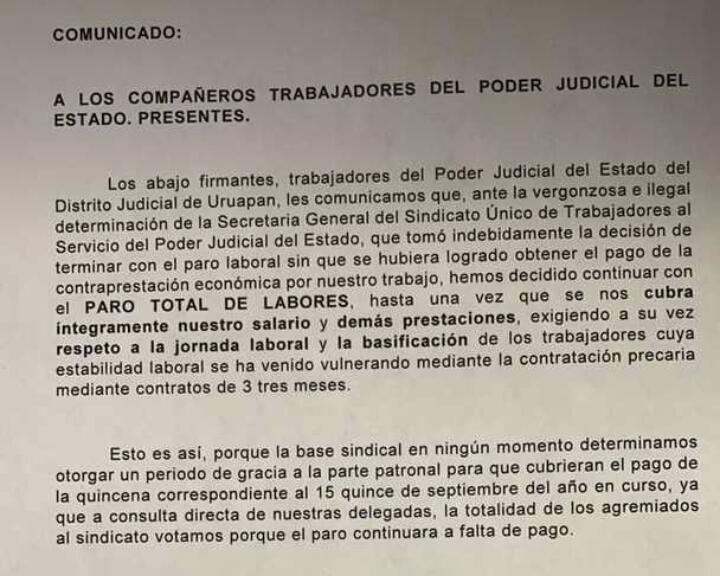 Los que comunicamos (distritos de Uruapan, Sahuayo, Zamora y Zinapécuaro) ante la vergonzosa e ilegal determinación del Comité y delegados del Sindicato Único de Trabajadores al Servicio del Poder Judicial del Estado de Michoacán, en tomar de manera indebida la decisión de terminar con el paro laboral, sin que se hubiera logrado obtener el pago de la contraprestación económica por nuestro trabajo, hemos decidido continuar con el PARO TOTAL DE LABORES, esto hasta una vez que se nos cubra íntegramente nuestro salario y demás prestaciones, exigiendo a su vez el respeto a la jornada laboral y basificación de los trabajadores, cuya estabilidad laboral se ha venido vulnerando mediante la contratación precaria a través de contratos consistentes en 3 tres meses.