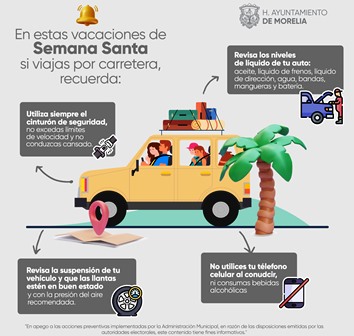 A unos días de comenzar la temporada de Semana Santa, el Ayuntamiento de Morelia emite una serie de recomendaciones de viaje para garantizar la seguridad y el bienestar de las y los ciudadanos, visitantes y turistas que paseen por la ciudad durante este período festivo.