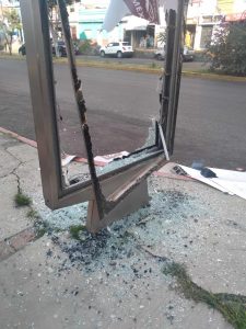 En su trayecto por la Avenida La Huerta, los jóvenes vandalizaron mobiliario urbano, destruyeron paradas de camiones y arrancaron señaléticas. Las fachadas de negocios quedaron cubiertas de pintas y vidrios rotos.