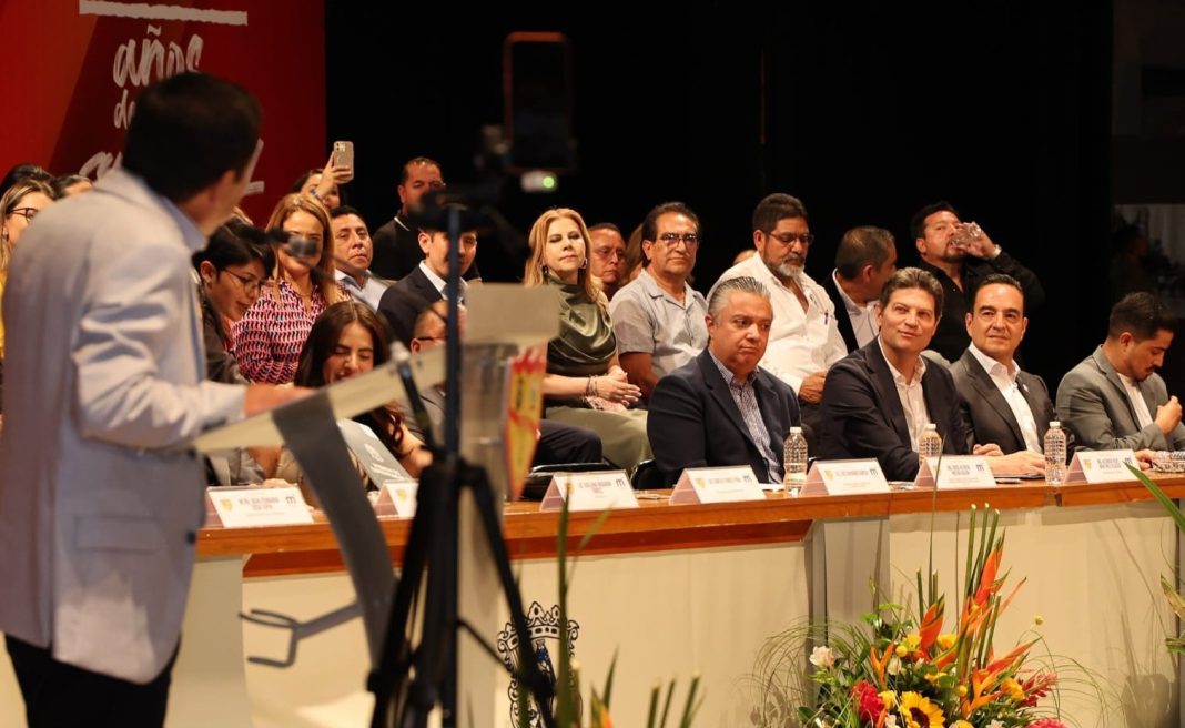 En un Teatro Morelos repleto y frente a autoridades estatales, municipales, legislativas y alcaldes, el líder sindical dijo «somos cómplices y testigos de su llegada de nuevo como presidente. Recuerdo esa frase: voy a regresar, y qué bien le hizo a Morelia».