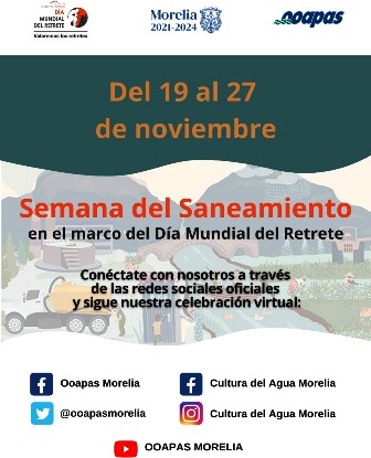 Del 19 al 27 de noviembre, el Organismo Operador de Agua Potable, Alcantarillado y Saneamiento de Morelia (OOAPAS) realizará “La Semana del Saneamiento”, una serie de actividades virtuales en el marco del Día Mundial del Retrete a celebrarse el próximo 19 de noviembre, fecha designada por la Organización de las Naciones Unidas (ONU) para sensibilizar a la opinión pública sobre los millones de personas que viven sin acceso a servicios de saneamiento gestionados de forma segura.