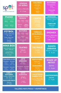 Entre las opciones disponibles se encuentran producción musical, guitarra, canto, batería, fútbol, voleibol, calistenia, patinaje, danza urbana, teatro, maquillaje, artes plásticas, vuelo de drones, talleres gastronómicos, mixología y muchas más actividades que cubren intereses musicales, deportivos, culturales, artísticos y tecnológicos.